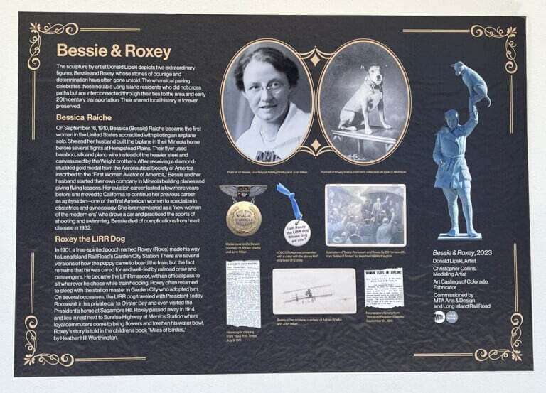 At the newly renovated Mineola Station, along the main line of the Long Island Railroad, stands a work of public art depicting two figures cast in bronze, which are larger than life, both historically and figuratively.