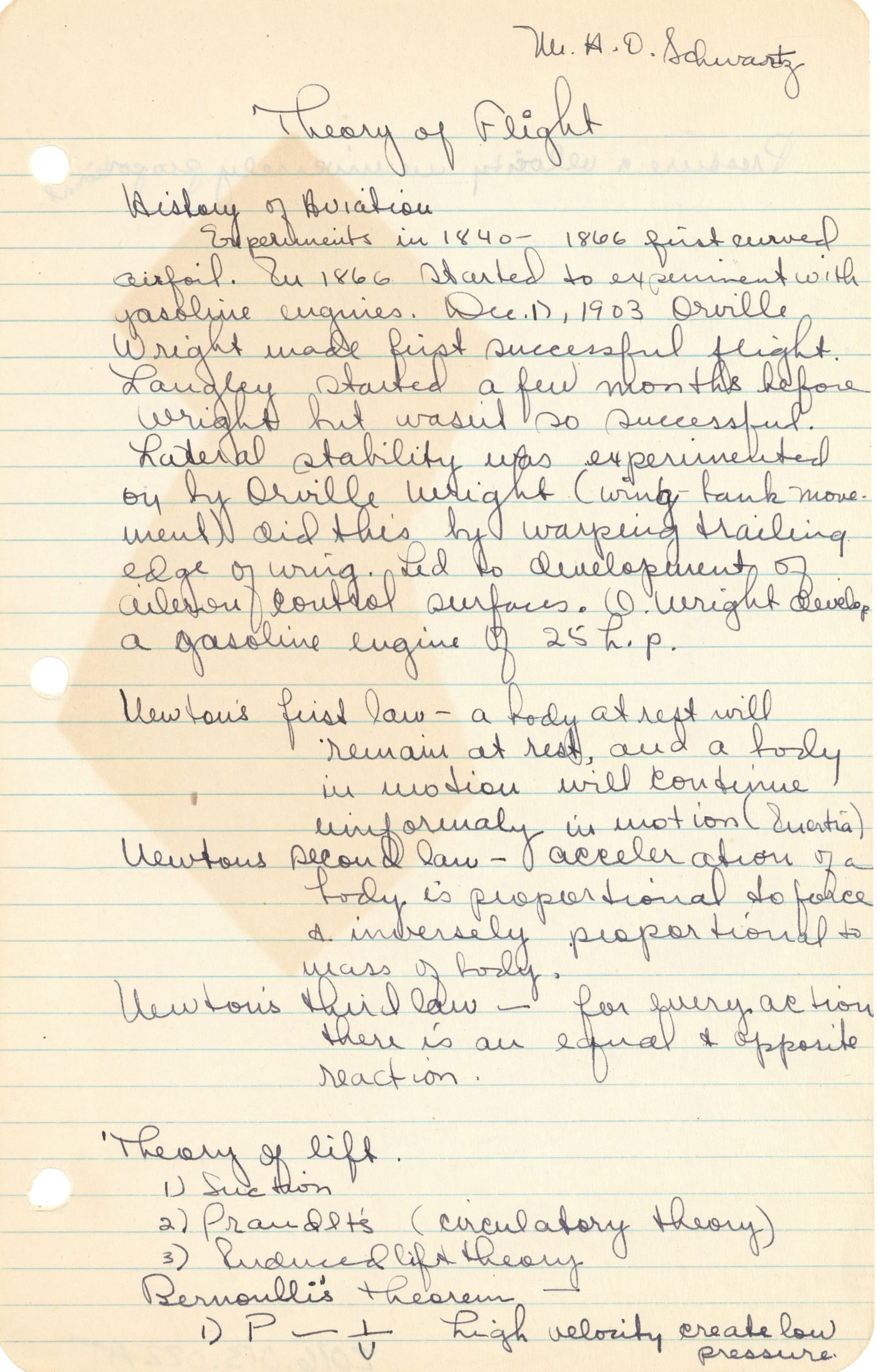 Solange’s notes provide a firsthand glimpse into the technical knowledge these women were expected to master. Topics include the Theory of Flight, Morse Code, Meteorology, and the Fundamentals of Air Cooling. These pages remind us of the intellectual rigor behind the WASP legacy and the dedication it took to earn their wings.