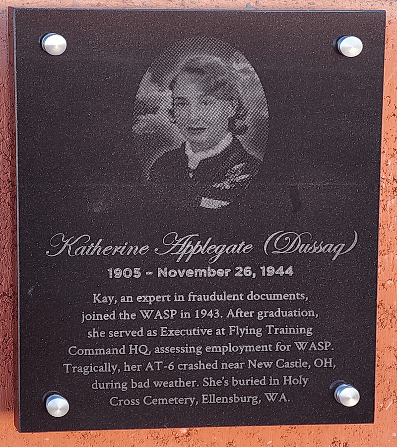Katherine “Kay” Applegate Dussaq was born in Washington and answered her country’s call with courage and conviction. In August 1943, she joined the WASP as part of Class 44-1 at Avenger Field — one of the brave women who took to the skies in service of freedom.