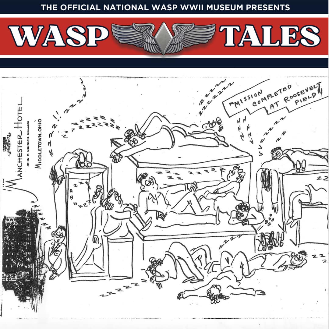 In addition to being a bugler, A.J. was a talented cartoonist who often drew comical cartoons about WASP training and flight operations while on active duty. In a September 2011 email I sent to A.J. via her daughter Julie, I asked A.J. about a specific cartoon that she had drawn about a ferry assignment that landed her at Roosevelt Field on Long Island. A.J. replied, “It was a delivery of a Fairchild PT26A- from Fort Erie, ONT. to Syracuse, Stewart (West Point), Fort Dix and delivered to Roosevelt Field. That was the cartoon I drew of all of us… exhausted and waiting for ‘SNAFU Air’ (Situation Normal All Fouled Up) to take us back to Fort Erie for another PT. My cartoons usually were drawn when we RON’ed (Remained Overnight), and they were drawn on the hotel stationery.”