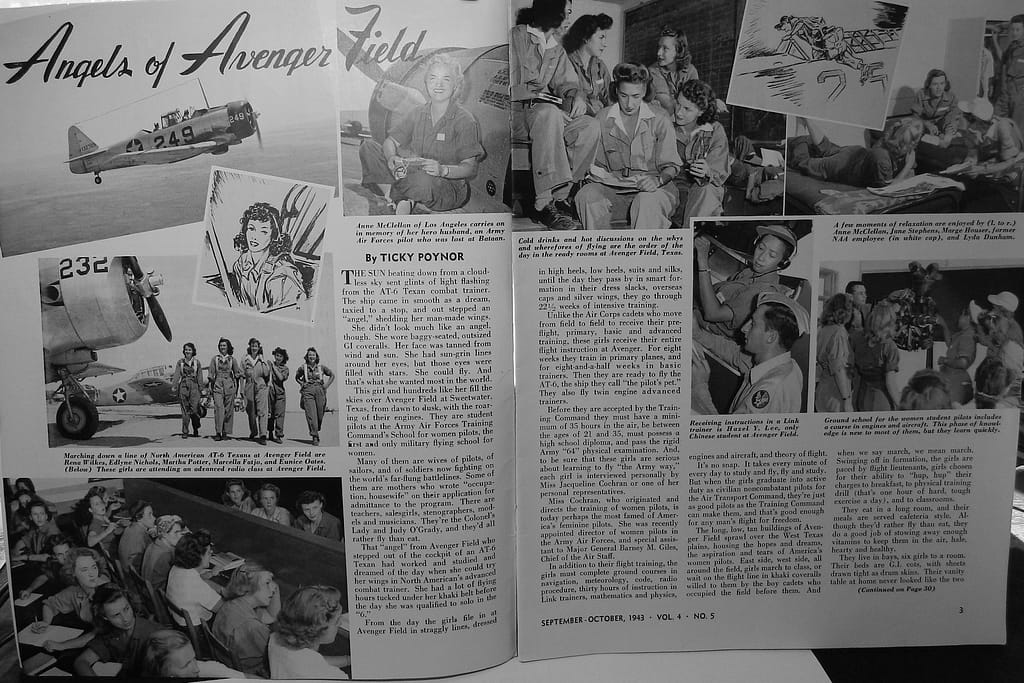 Looking through the magazines I found that the September-October, 1943, issue has a full-cover, full-color photo of WASP gathered around a red-nosed AT-6 Texan. Inside is a nearly three-page feature article on the WASP titled: “Angels of Avenger Field.”