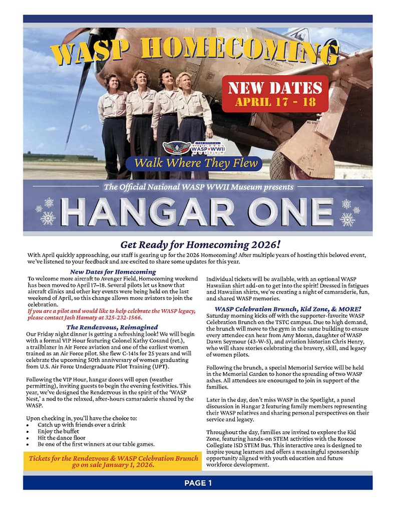 Keep updated with the latest news, articles, and events at the WASP WWII Museum by reading our monthly newsletters. Subscribe to our mailing list to get exclusive WASP content.